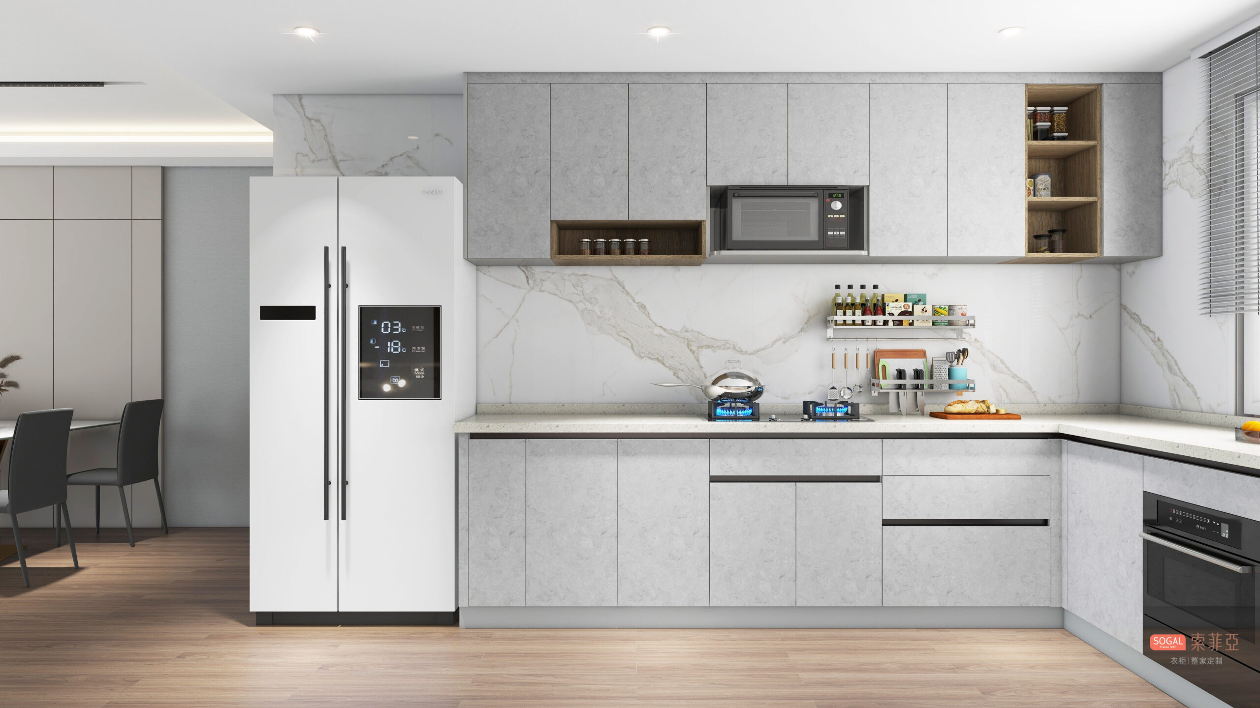 Features premium appliances including hob, chimney, fridge, microwave, as well as cutlery and crockery for a complete culinary experience.